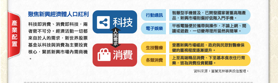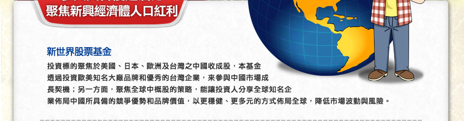 本基金主要投資於與重要經濟體經貿往來密切之國家,主要針對新世界市場經濟高速發展下受惠地區進行擇優佈局,本基金之主要投資風險除包含一般股票型基金之投資組合跌價與匯率風險外,與成熟市場相比須承受較高之政治與金融管理風險,而因市值及制度性因素,流動性風險也相對較高,新興市場投資組合波動性普遍高於成熟市場。 |