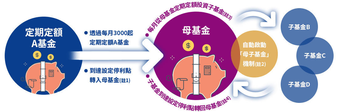 (註1) 定期定額A基金到達設定停利點轉入母基金後,依然維持原A基金繼續扣款。(註2)「母子基金」啟動最低金額門檻,為停利至母基金的金額累積達每月子基金扣款金額之20倍。