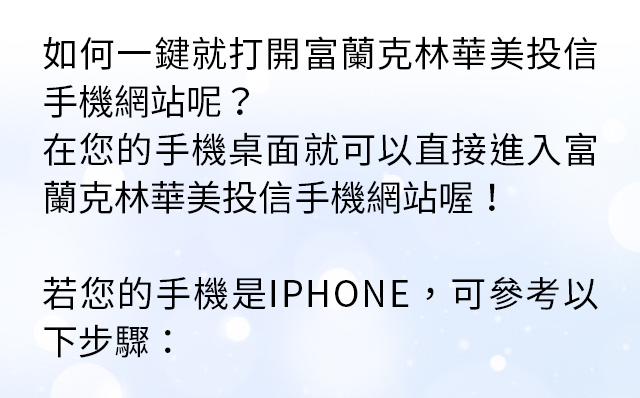 • 本網站提及個股評論並非對個股進行推介、建議或買賣,且並不完全代表本基金之投資標的。本網站提及經濟走勢預測,不必然代表基金之績效,本基金投資風險請詳閱基金公開說明書。本網站資訊僅供參考。本公司自盡力為讀者及客戶提供正確的意見及消息,如有錯漏或疏忽,本公司或關係企業與其任何董事或受僱人,並不負任何法律責任。本網站內容未經同意,不得重製、散布、改作,亦不得轉載於任何形式媒體。【富蘭克林華美投信獨立經營管理】