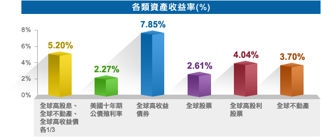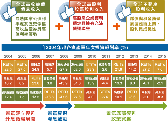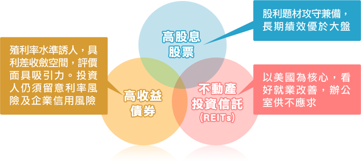 同時布局「高收益債券(配息)、高股息股票(股利報酬)、REITs(租金收益)」三大收益資產,有機會享豐沛投資收益。