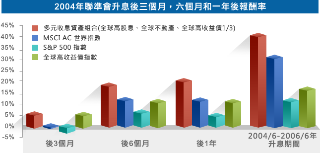利率中長期將從歷史低點逐步攀升,FED啟動升息等於為景氣背書。 把握升息後的進場時間,採用多元收息資產組合(全球高股息、全球不動產、全球高收益債各1/3)來布局,靠收益產品提高勝算
