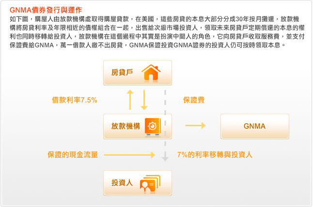 |  | | 美國政府機構債券 | | 由美國聯邦政府所擁有、擔保或資助之大型機構所發行的債券稱為美國政府機構債券。最常見的機構債券為抵押貸款收入移轉證券(mortgage pass-through securities),例如由政府國家房地產抵押協會(Government National Mortgage Association,簡稱GNMA)所發行的移轉證券、聯邦國家房地產抵押協會(Federal National Mortgage Association,簡稱FNMA)所發行的移轉證券,或聯邦住宅貸款抵押公司(Federal Home Loan Mortgage Corporation,簡稱FreddieMae)所發行的移轉證券。 機構債券之發行目的在於籌措以下特定機構計劃之所需經費:房地產抵押貸款、升學貸款、自然資源保護計劃。在這些機構當中,只有GNMA是由美國政府提供完全信用保證;而FNMA和Freddie Mae則是以機構本身向美國財政部融資的權利作為擔保,保障相對較弱。至於其他種類的政府機構債券也可能為非政府擔保的債券。因為GNMA債券有美國政府擔保按時支付本金與利息,佔美國債券市場規模的比重也有日益增加趨勢,足見房地產抵押債的重要性。以下就GNMA債券發行與運作為您做簡單的說明: |  | | 地方公債 | | 地方公債(Municipal Bonds)是州立和地方政府、所屬機構為了籌措各項公共事業所需經費而發行的債務證券。地方公債又可稱為免稅(tax- exemptor tax-free)債券。地方公債的利息所得通常免課正常的聯邦所得稅。在發行期間,地方公債的利息所得通常也免課州稅和地方稅。地方公債所提供的稅前收益通常低於應稅的債券。然而,地方公債的稅後收益通常高於一般債券;因此,投資人的適用稅率愈高,地方公債的節稅效果也愈顯著。州、市、郡及其所屬機構發行地方公債的目的:籌措各項公共工程所需經費,如:學校、高速公路、運動場、污水處理系統、橋樑等或籌措機構的營運經費。 | | 公司債 | | 企業可透過發行公司債,來籌措擴充產能或設備更新等計劃所需的資金、支付營運費用、籌措併購或其他企業結構改變所需的資金。公司債的到期日不一而足,可能介於1年-40年之間。雖公司債與政府公債相似,具有半年或一年付息、以及到期償還本金的特性,但由於公司債為企業發行,其違約風險,一般而言較政府公債為高,且其走勢受企業獲利與股價影響,因此票面利率一般而言也較政府債券高。 | | 美國以外的政府債與新興市場債券 | | 投資新興市場的風險就是金融市場的變動幅度比工業國家大許多,而想要將風險降到最低,在介入新興國家固定收益市場時,就必須選擇投資於拉丁美洲、東歐及亞洲為主的新興國家政府在海外發行的美元計價且固定票面利率的境外美元債券或布萊迪債券,這些特性可使得新興國家固定收益型基金不受到新興市場國內匯率以及利率波動的影響且債信評等較佳。 雖然新興國家債券市場價格波動較工業國家債市大,但票面利率也較高;此外,在景氣復甦的時候,新興國家政府債有機會隨著債信等級獲得調升而產生資本利得的獲利空間。 |