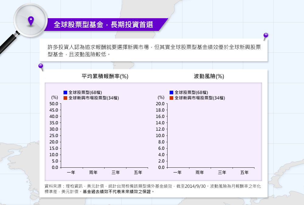• 由於新興市場基金之主要投資風險除包含一般股票型基金之投資組合跌價與匯率風險外,與成熟市場相比須承受較高之政治與金融管理風險,而因市值及制度性因素,流動性風險也相對較高,新興市場投資組合波動性普遍高於成熟市場。基金投資均涉及風險且不負任何抵抗投資虧損之擔保。投資風險之詳細資料請參閱基金公開說明書。
